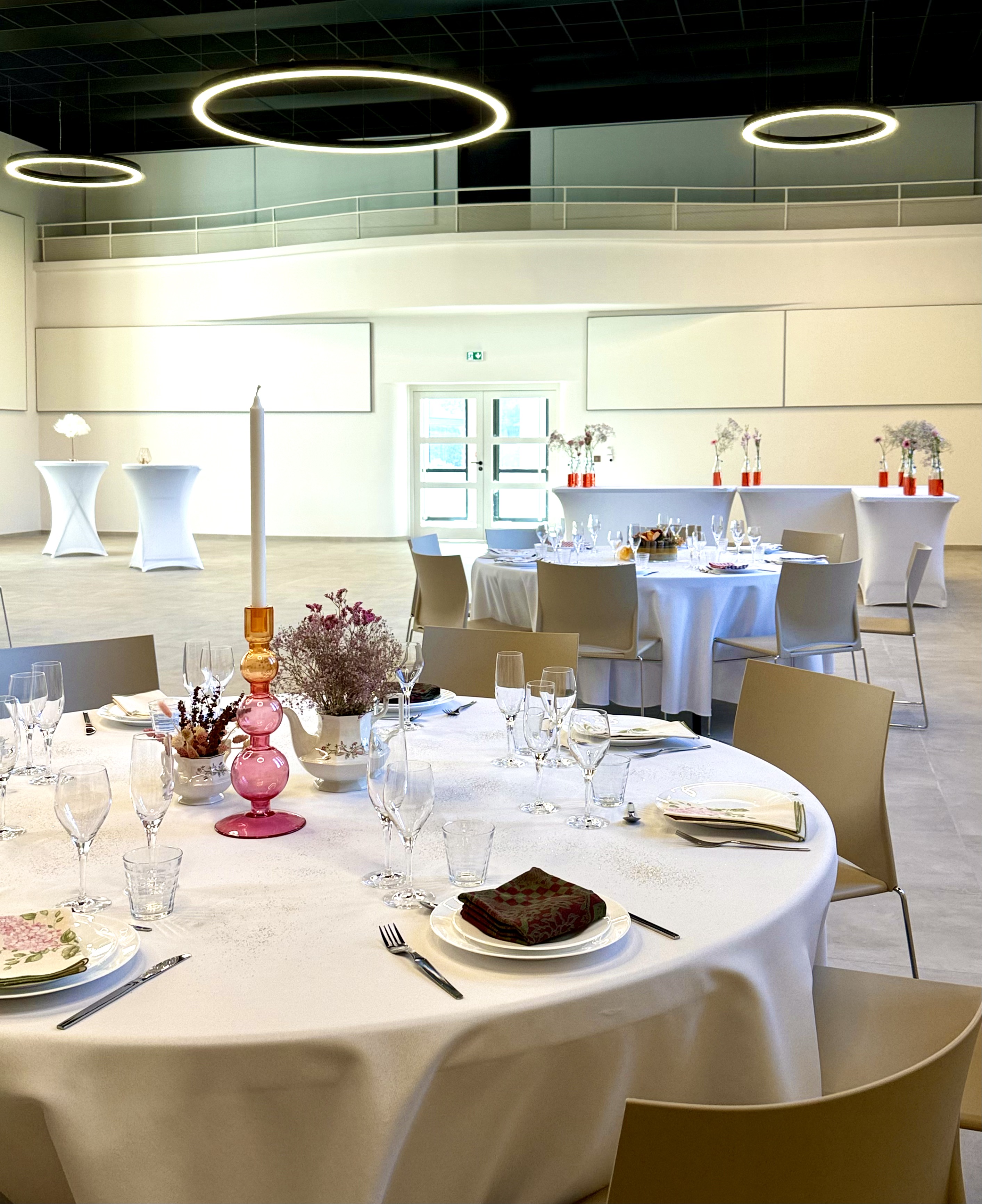 26 tables rondes de 180cm de diamètre et nappes blanches